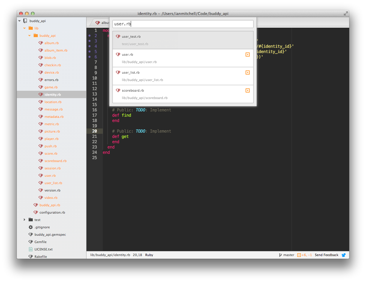 Finally, Atom's Fuzzy Finder needs some serious work. Typing user.rb into the fuzzy finder doesn't return user.rb first, but rather user_test.rb.