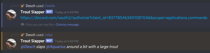 It's finally time to begin working on our commands. We'll create two of them - one that implements the famous /slap command from IRC, and another that sends a bot invitation link to users who also want to add the bot to their own servers.