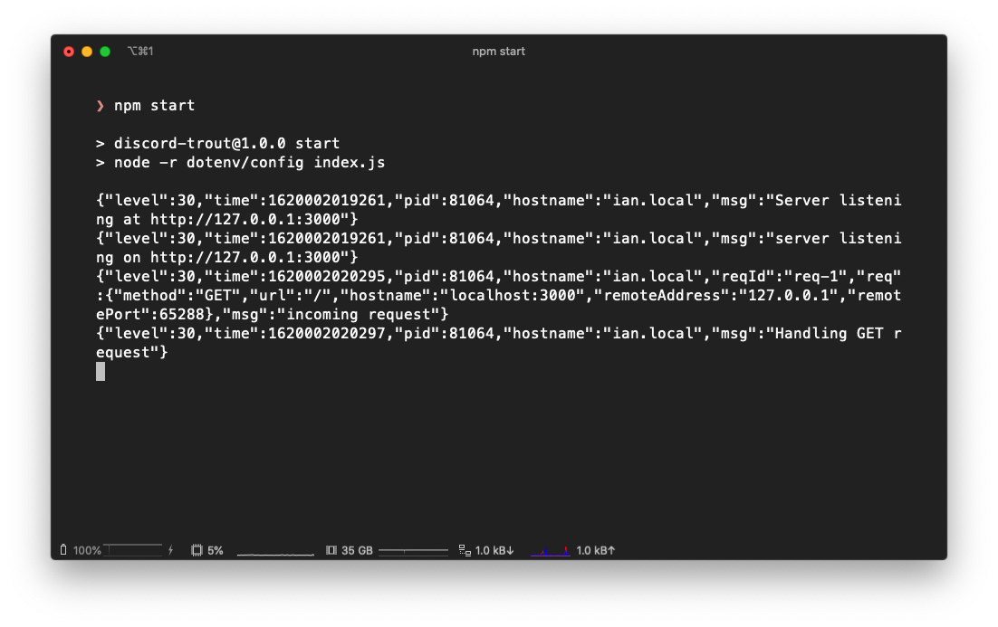 import fastify from "fastify";const server = fastify({ logger: true,});server.get("/", (request, response) => { server.log.info("Handling GET request");});server.listen(3000, async (error, address) => { if (error) { server.log.error(error); process.exit(1); } server.log.info(`server listening on ${address}`);});