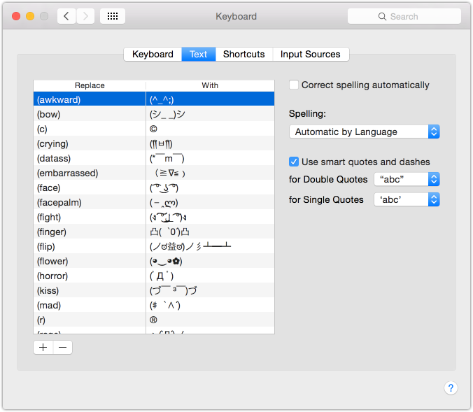 I'm a big fan of Japanese style text faces; I vastly prefer them to the standard iOS emoji keyboard. Unfortunately, they're pretty difficult to type out. In order to make them a bit more accessible, I use a fun trick I picked up from @Tenderlove. By adding custom replacement phrases to autocorrect, you can use complex text faces quickly.
